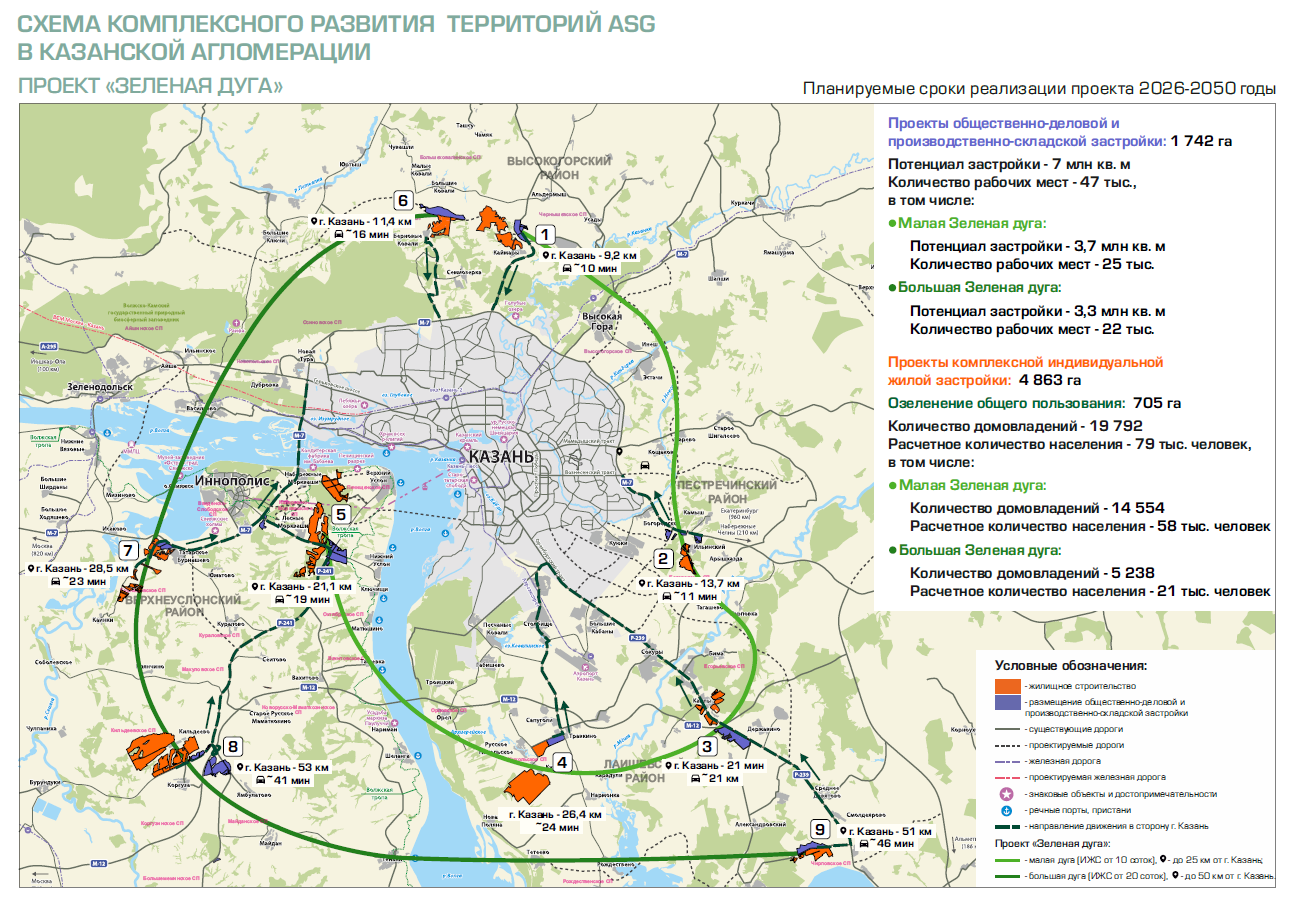 «Зеленая дуга», по замыслу разработчиков, призвана внести существенный вклад в решение проблемы маятниковой миграции. Спроектировано 9 зон развития в районах, прилегающих к Казани, с размещением мест приложения труда и расположенных на пересечениях ключевых автомобильных магистралей. Зоны развития дополняются низкоплотной индивидуальной жилой застройкой.
