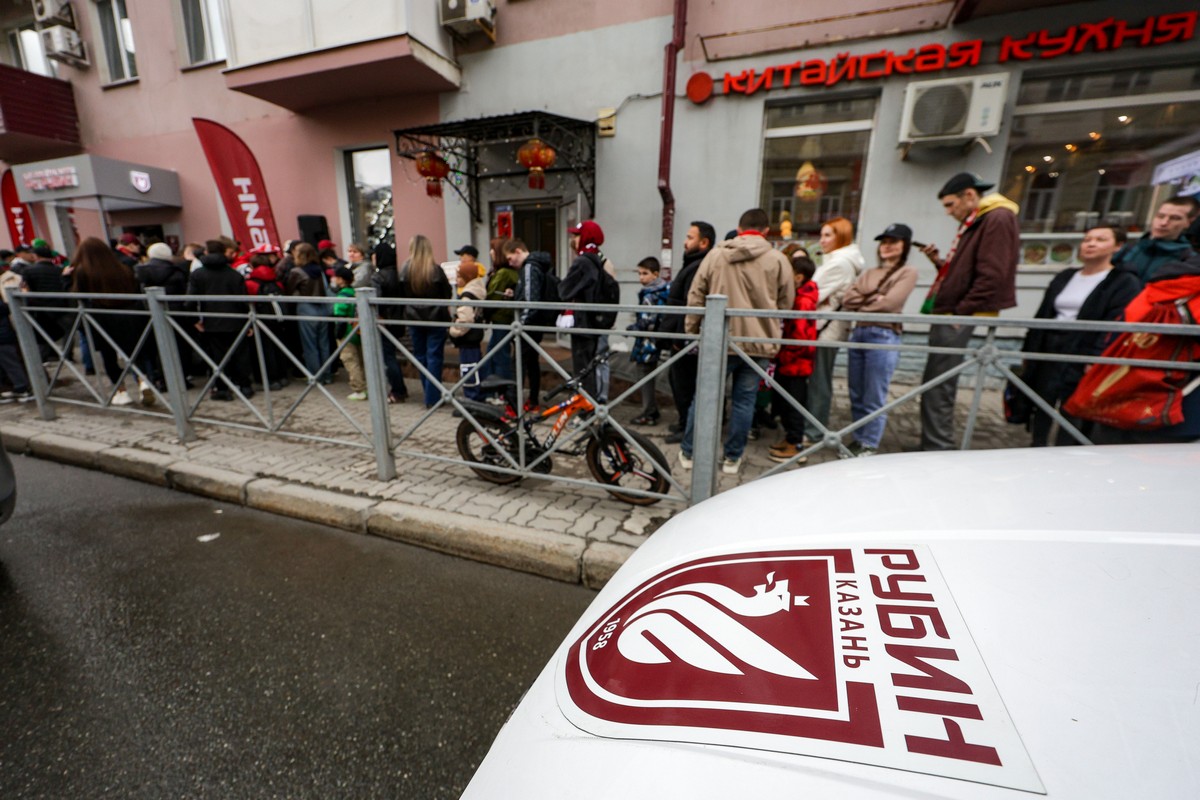 Уже за два часа до официального открытия у магазина стала скапливаться очередь. Ближе к старту она стала внушительной. Прохожие не понимали, отчего такая толкучка на тротуаре, но, увидев танцующего дракона Руби, флаги «Рубина» и игроков, волей-неволей тоже заходили в магазин.